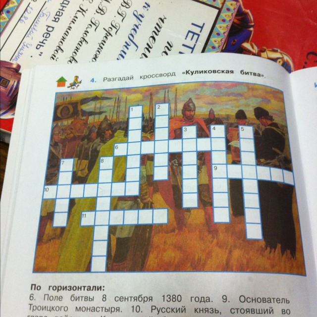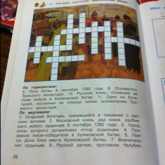 Иван I Данилович Калита (год рождения неизвестен — умер 31.3.1340), князь московский с 1325, великий князь Владимирский с 1328; сын московского князя Данилы Александровича. Был жестоким и хитрым, умным и упорным в достижении своих целей правителем. Сыграл большую роль в усилении Московского княжества, собирании русских земель вокруг Москвы, используя в этих целях помощь Золотой Орды, для которой он собирал с населения огромную дань. Беспощадно пресекал народное недовольство, вызывавшееся тяжёлыми поборами, расправлялся с политическими противниками — другими русскими князьями. Влияние И. I распространилось на ряд земель Северо-Восточной Руси (Тверь, Псков, Новгород и др.). Он накопил большие богатства (отсюда его прозвище "Калита" — "кошель", "денежная сумка"), которые использовал для покупки земель в чужих княжествах и владениях. При И. I Москва стала резиденцией митрополита "всея Руси", что имело важное значение, так как церковь пользовалась большим идеологическим и политическим влиянием. Деятельность И. I способствовала тому, что была заложена основа политического и экономического могущества Москвы и начался экономический подъём Руси. Лит.: Черепнин Л. В., Образование русского централизованного государства в XIV—XV вв., М., 1960. 3. Москва 4. Князя - победителя в Куликовской битве звали Дмитрием, и за эту победу ему было присвоено прозвище Донской, так как Куликово поле расположено возле Дона. 5. Непрядва 7 мамай 9 пересвет