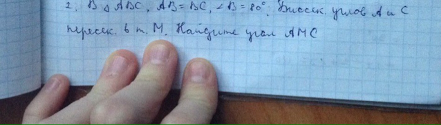 В треугольнике АБС АБ=БС, угол Б=80 градусов. Найдите угол АМС