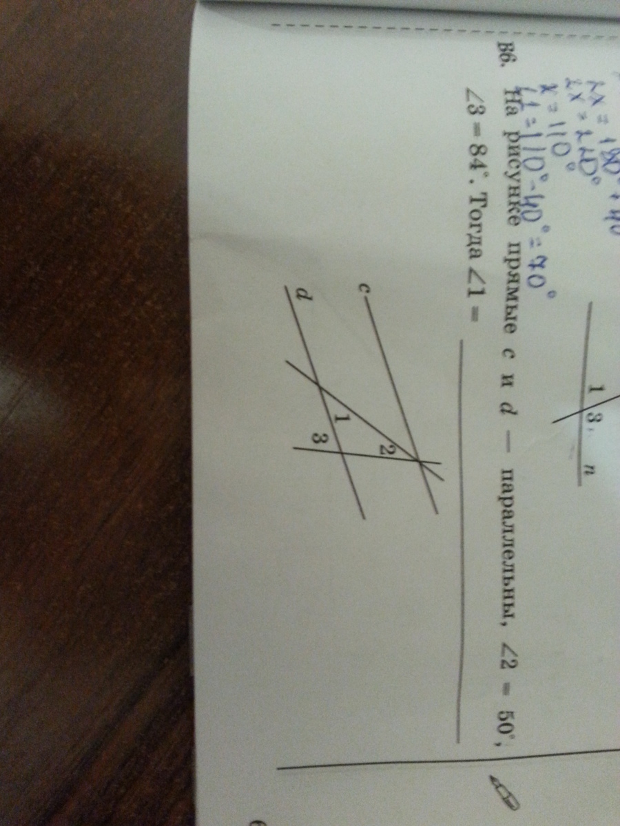 На рисунке прямые c и d - параллельны, угол 2 равен 50°, угол 3 равен 84°.Тогда угол 1 равен ?°