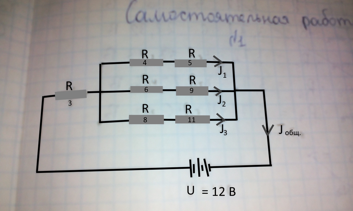 Найти: U1,2,3,4,5,6,7 и Jобщ, J1, J2, J3 (Всмысле J на каждой линии).