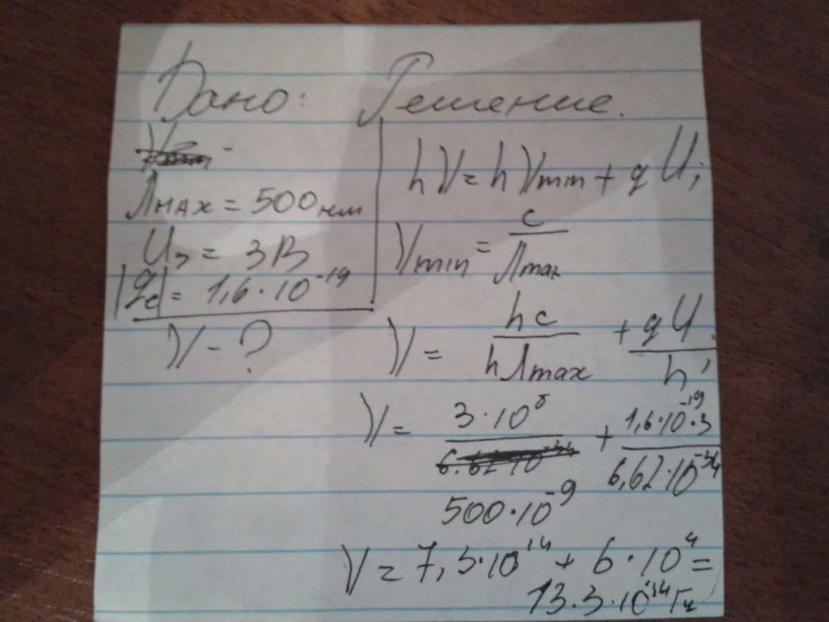 Красная граница фотоэффекта для металла равна 500нм.При какой частоте света вырванные из поверхности металла электроны полностью задерживаются потенциалом 3 В?