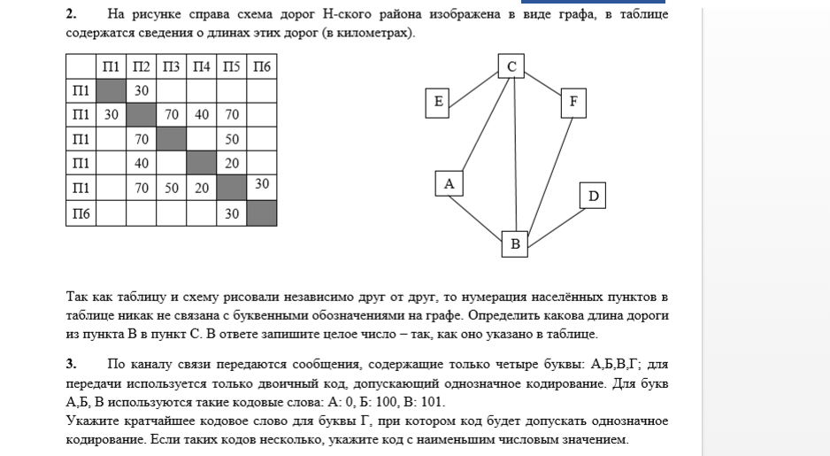 1. Пункты B и C - единственные, из которых выходит по четыре пути. Значит в таблице это п2 и п5.