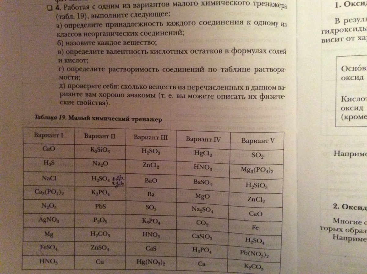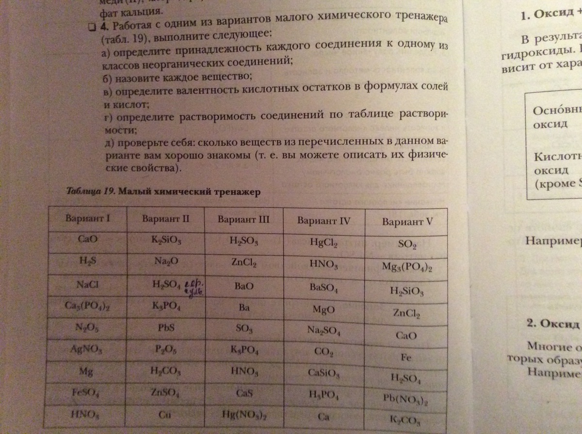 4 вариант: HgCl2 - хлорид ртути (II), HNO3 - азотная кислота, BaSO4 - сульфат бария, MgO - оксид магния, Na2SO4 - сульфат натрия, CO2 - оксид углерода (IV), CaSiO3 - силикат кальция, H3PO4 - фосфорная кислота, Ca - кальций.