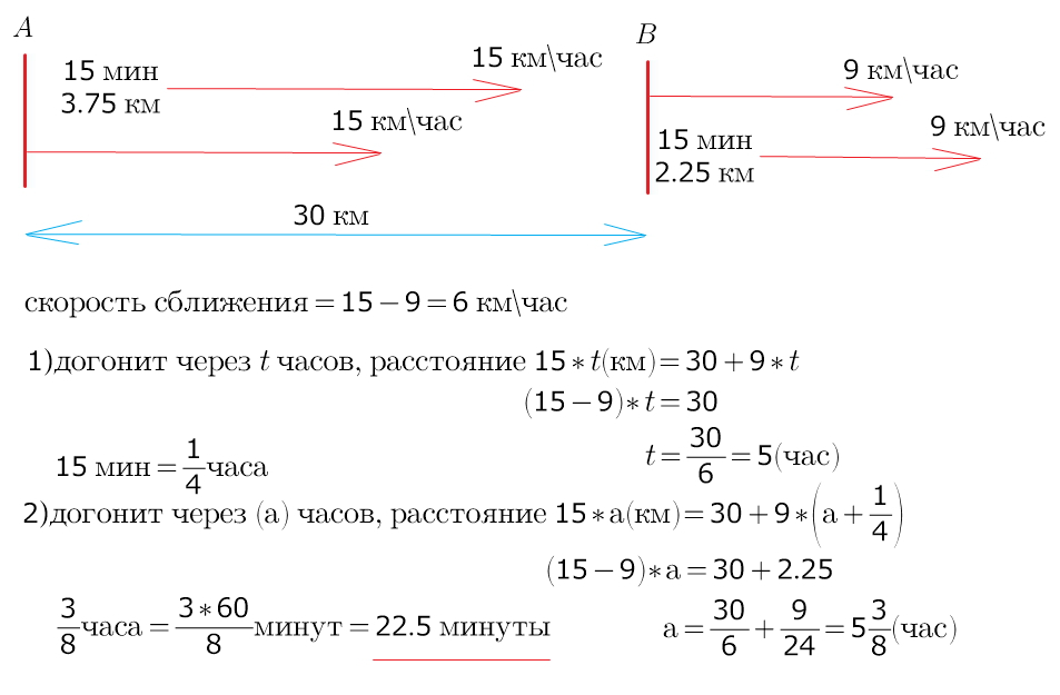 Из пункта А в пункт Б с интервалом в 15 минут выехали два велосипедиста со скоростью 15 километров в час С каким интервалом во времени один после другого они догонит велосипедиста выехавшего из пункта Б одновременно с первым велосипедистом из А в том же направлении ехавшего со скоростью 9 километров в час если расстояние между А и Б равно 30 километров