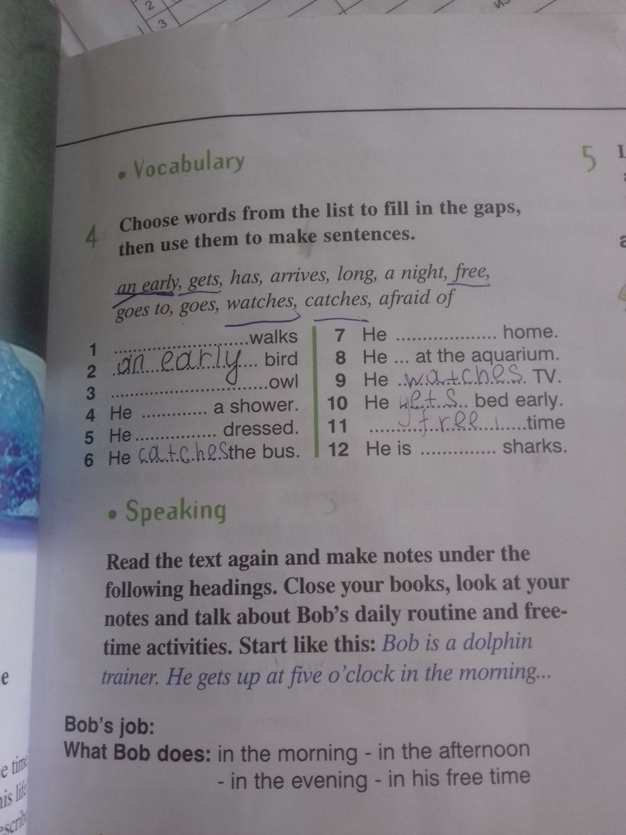 He has house - он имеет дом, he is afraid of sharks - он боится акул, he goes to walks - он ходит гулять, he goes a shower - он идет в душ, a night olw - сова, ночная сова, he arrives dressed - он приезжает одетый (на пример, на праздник) - переведенные слова не надо писать.