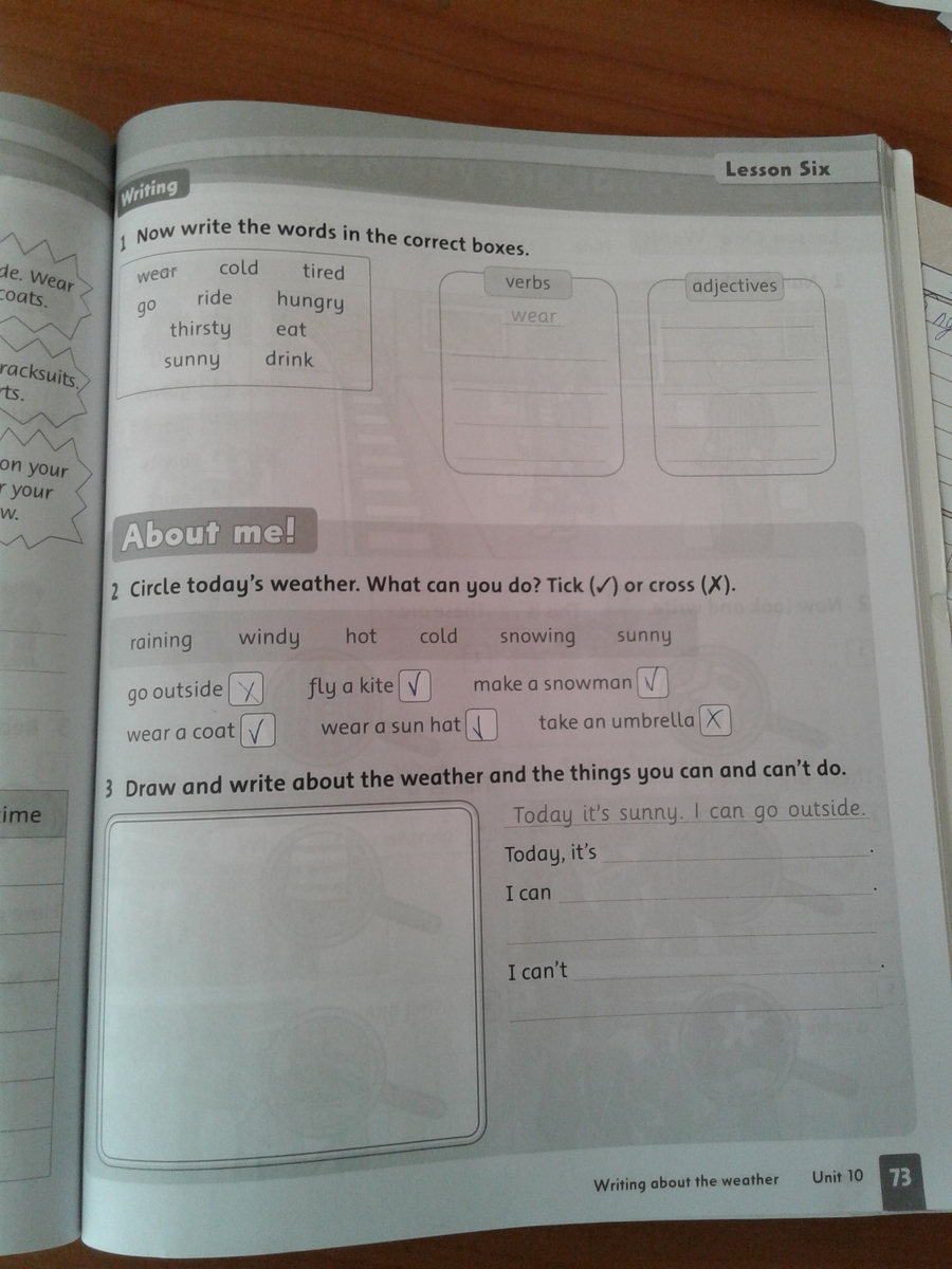 Adjectives: cold, sunny, tired, hungry.