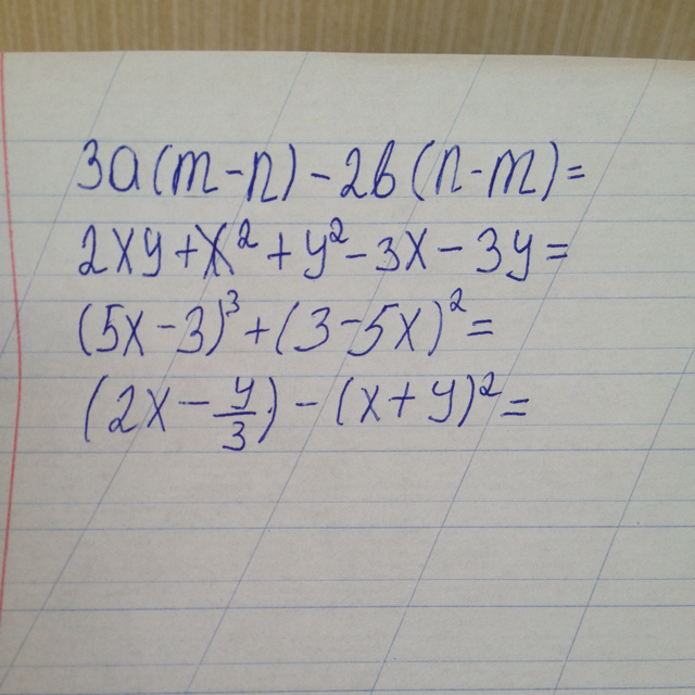 3а(m-n)-2b(n-m)=3a(m-n)-2b(-(m-n))=3a(m-n)+2b(m-n)=(m-n)(3a+2b)