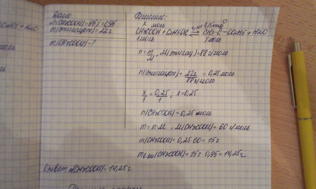 Помогите решить задачу: "Найти массу 95% паствора CH3COOH необходимой для получения 22г этилацетата"