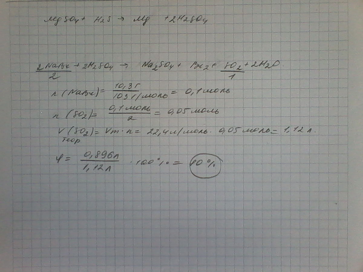 При действии концентрированной серной кислоты на бромид натрия массой 10,3 г выделился оксид серы (ІV) объемом 0,896 л(н.у.). Выход продукта реакции по уравнению
