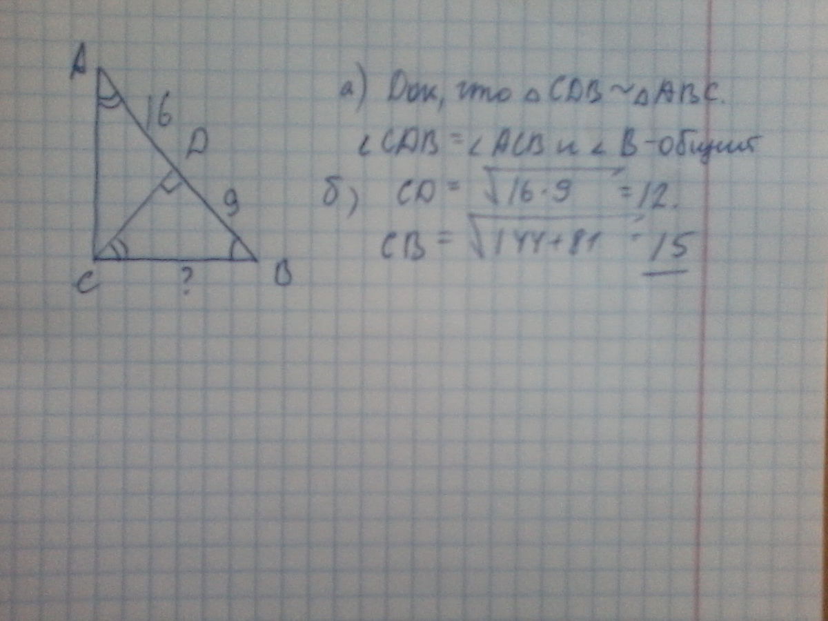 Высота CD прямоугольного треугольника ABC делит гипотенузу на части AD на части AD=16 и BD=9. Доказать , что CBD подобен ABC и найти BC.