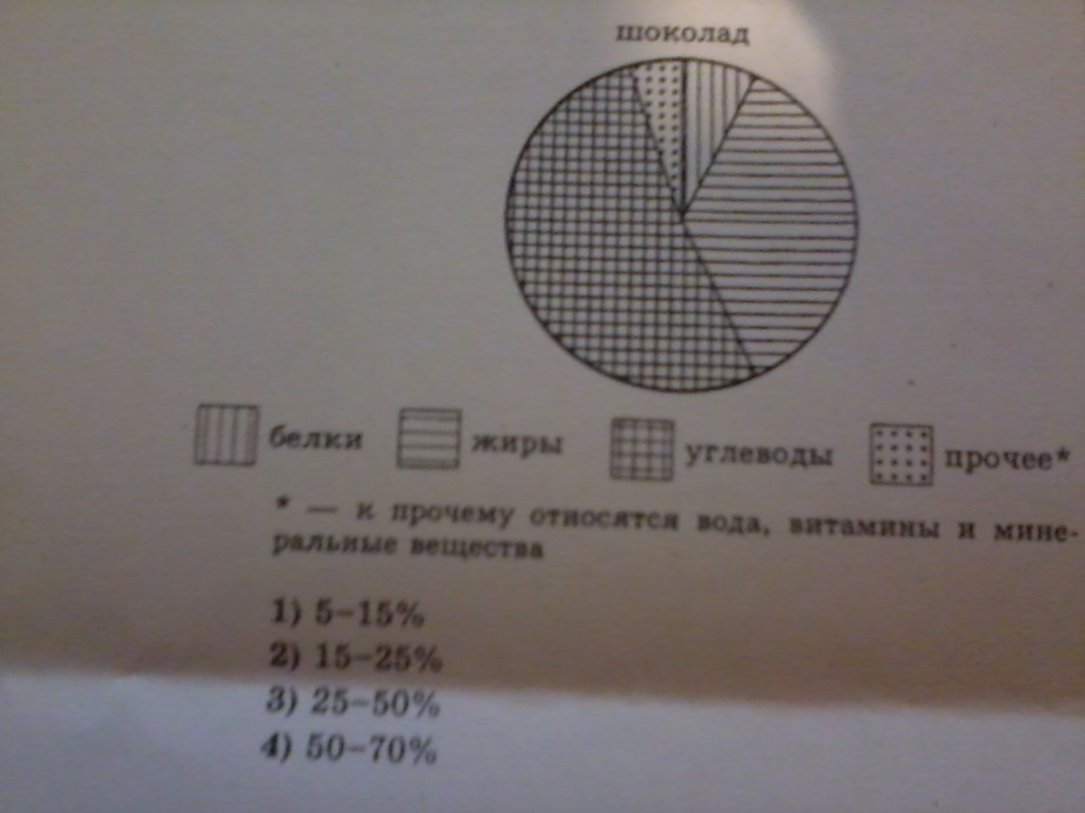 На диаграмме показано распределение питательных веществ в молочном шоколаде. Определите по диаграмме, в каких пределах находится содержание углеводов