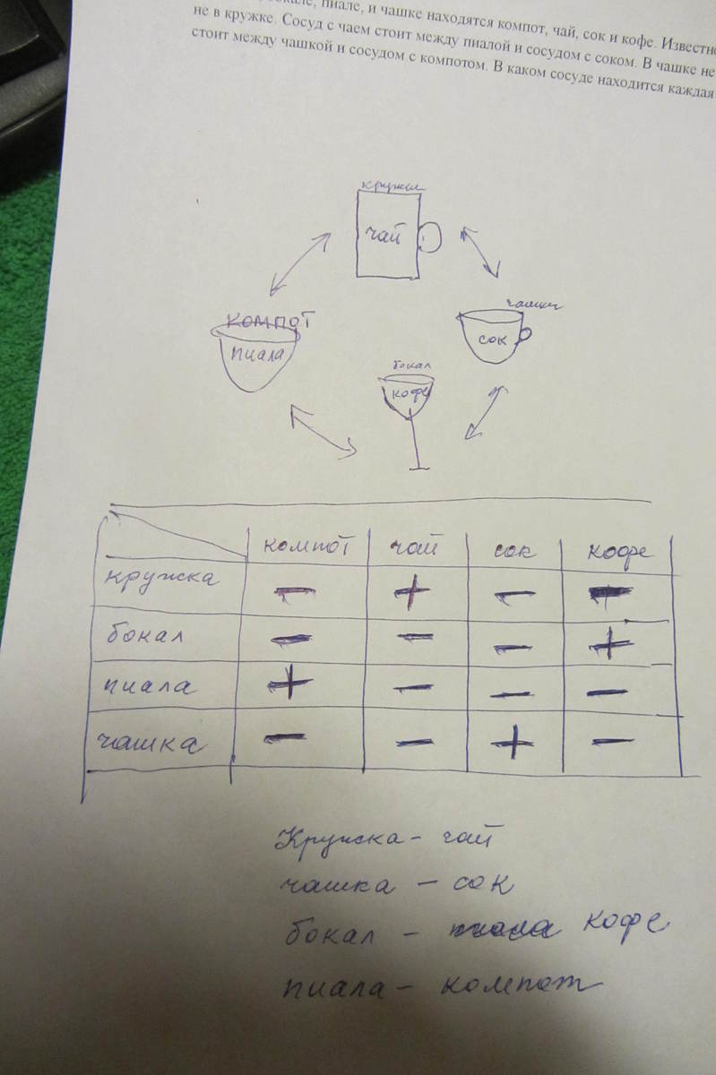 В кружке, бокале, пиале, и чашке находятся компот, чай, сок и кофе. Известно, что кофе и компот не в кружке. Сосуд с чаем стоит между пиалой и сосудом с соком. В чашке не чай и не кофе. Бокал стоит между чашкой и сосудом с компотом. В каком сосуде находится каждая из жидкостей?