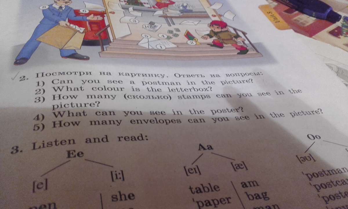 1вы видите почтальона на картинке?2какого цвета почтовый ящик?3сколько марок вы видите на картинке?4что вы видите на плакате?5сколько конвертов вы видите на картинке?