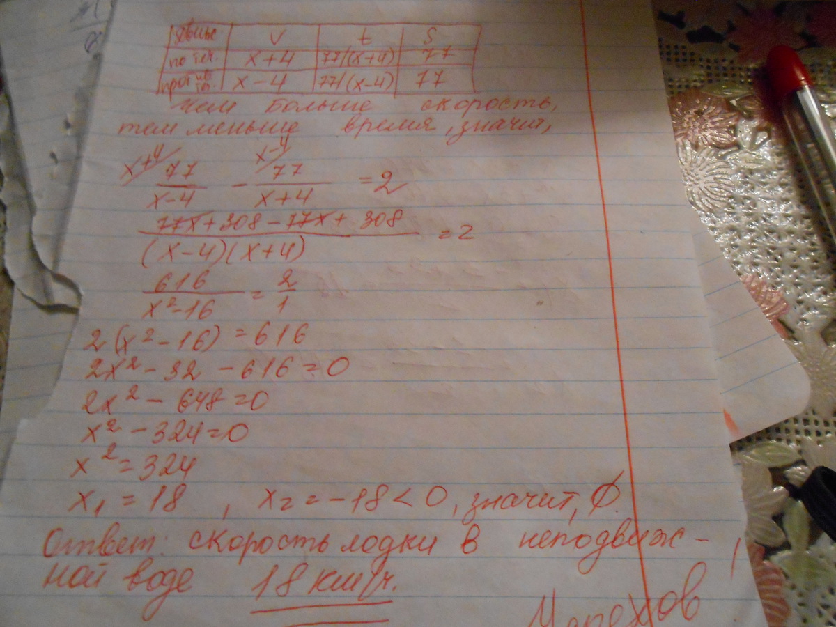 Моторная лодка прошла против течения реки 77 км и вернулась в пункт отправления, затратив на обратный путь на 2 часа меньше, чем на путь против течения. Найдите скорость лодки в неподвижной воде, если скорость течения реки равна 4 км/ч.