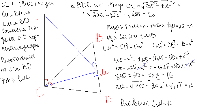 через вершину прямого угла с треугольника BCD проведена прямая L перпендикулярная плоскости треугольника BCD. Найдите расстояние между прямыми c и bd если bd 25 bc 15