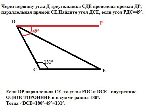Через вершину угла Д треугольника СДЕ проведена прямая ДР, параллельная прямой СЕ.Найдите угол ДСЕ, если угол РДС=49°.