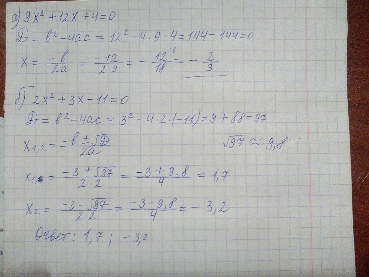 а) 9х2 + 12х + 4 = 0; б) 2х2 + Зх - 11 = 0. решите пожалуйста с подробностями. зарание спасибо)))