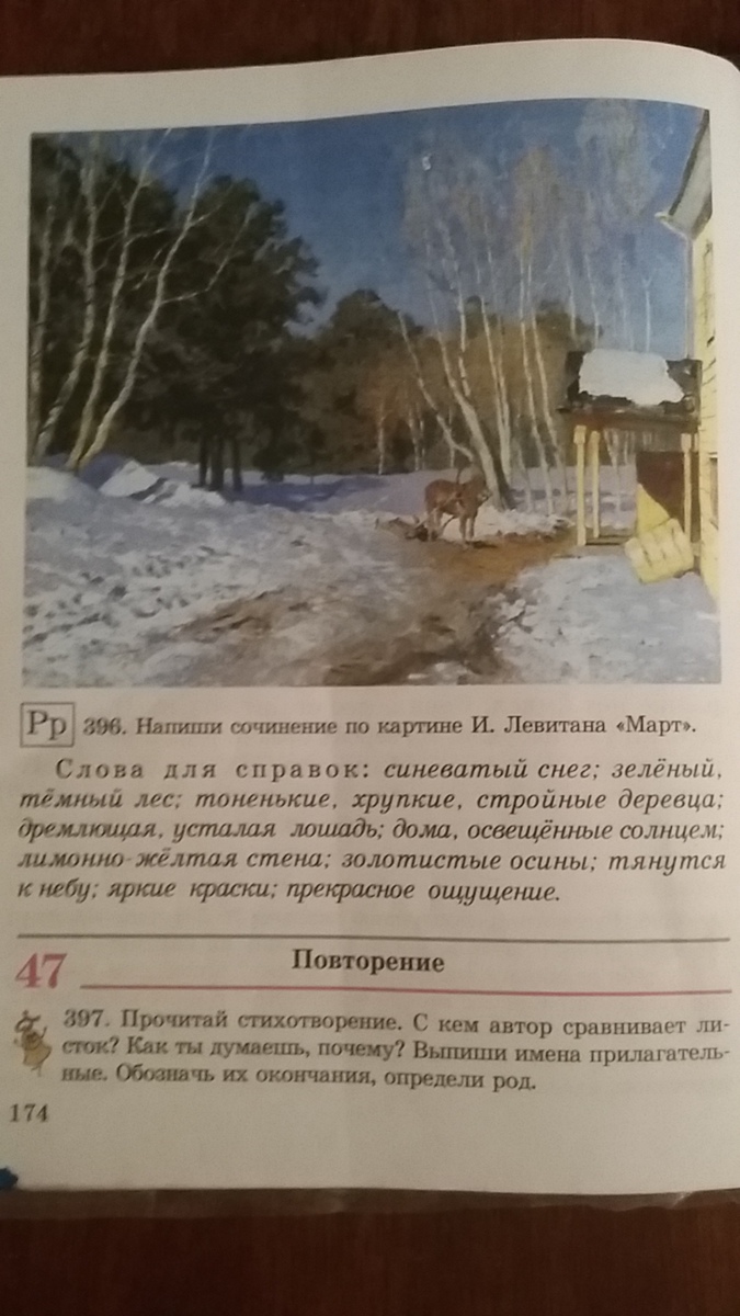 Во дворе стоит рыженькая,усталая лошадка, запряженная в деревянные сани. Лимонно-жёлтая стена дома гармонирует с белоснежными стволами берез. Вообще цвета на картине, яркие, невероятно сочетаются друг с другом. . А стволы березок, тянущиеся к солнцу, еще и создают неповторимо красивый рисунок линий на картине. Исаак Левитан — действительно непревзойденный мастер изображения пейзажей России.