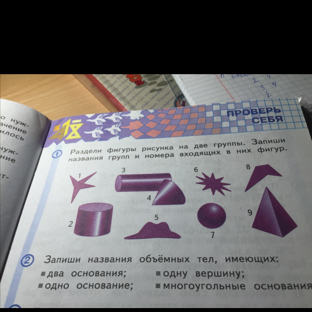 Вторая группа: 2,3,4,7,9 это объёмные фигуры.