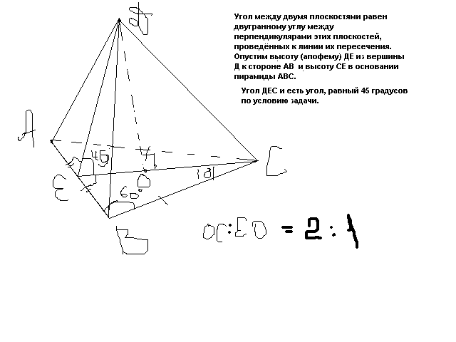 Рассмотрим треуг. ДОЕ: угол ДЕО = 45 град.; ЕО = (√3)/2.
