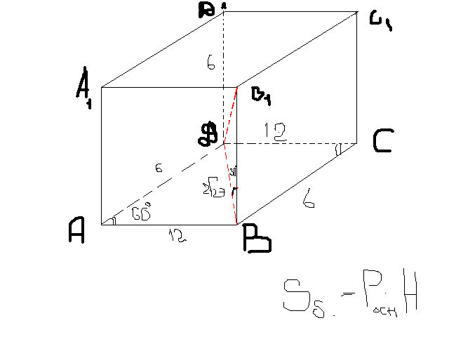 1) Основанием прямой призмы ABCD A1 B1 C1 D1 являеться параллелограмм ABCD со стороной 6дм и 12дм углам, равным 60: Диагональ B1Д призмы образует с плоскостью основания угол 30 градусов Найти площадь боковой поверхности призмы.