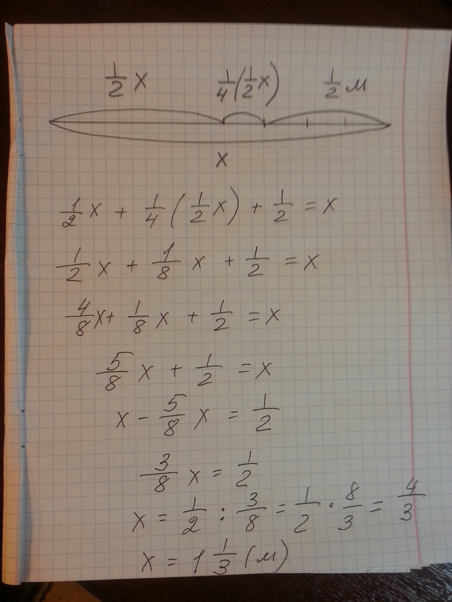 От куска ткани сначала отрезали половину потом четвёртую часть остатка после чего в кусе осталось полметра ткани. Сколько метров ткани было?