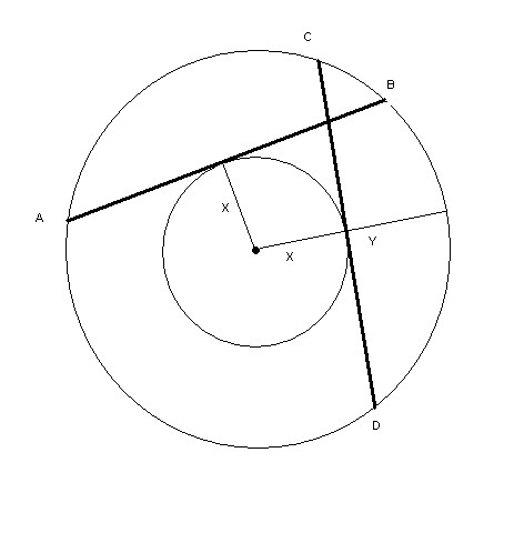Многим в школах обьясняют что хорды ровны, если расстояние от центра окружности к хордам ровны, а у нас расстояние равно радиусу маленькой окружности=> хорды ровны)