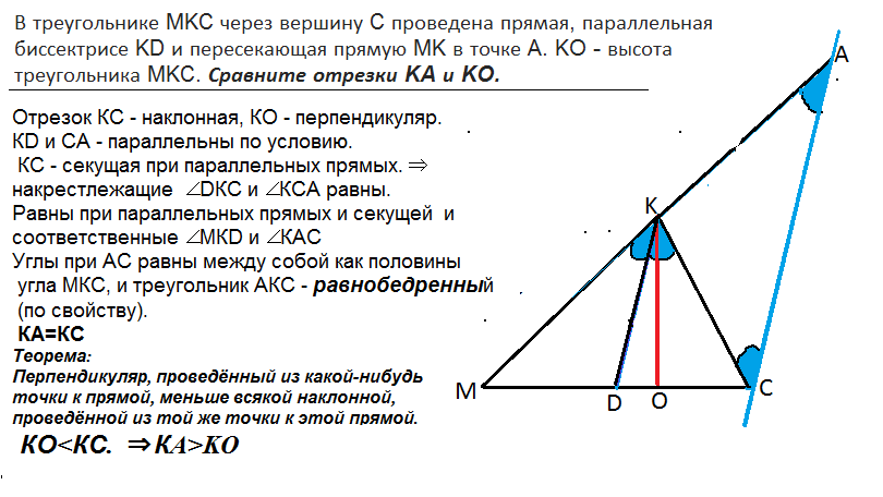 В треугольнике MKC через вершину C проведена прямая, параллельная биссектрисе KD и пересекающая прямую MK в точке A. KO - высота треугольника MKC.