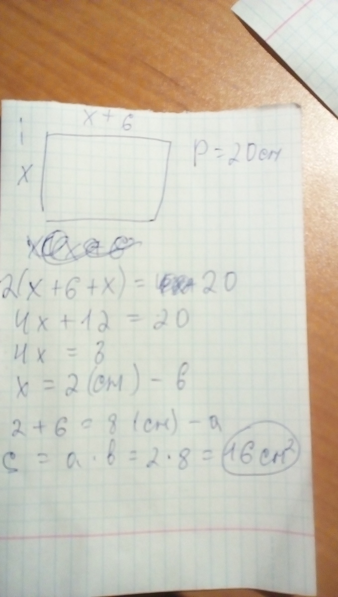 Пусть x см - ширина, тогда x+6 см - длина. Периметр данного прямоугольника равен (x+x+6)*2 см или по условию, 20 см.