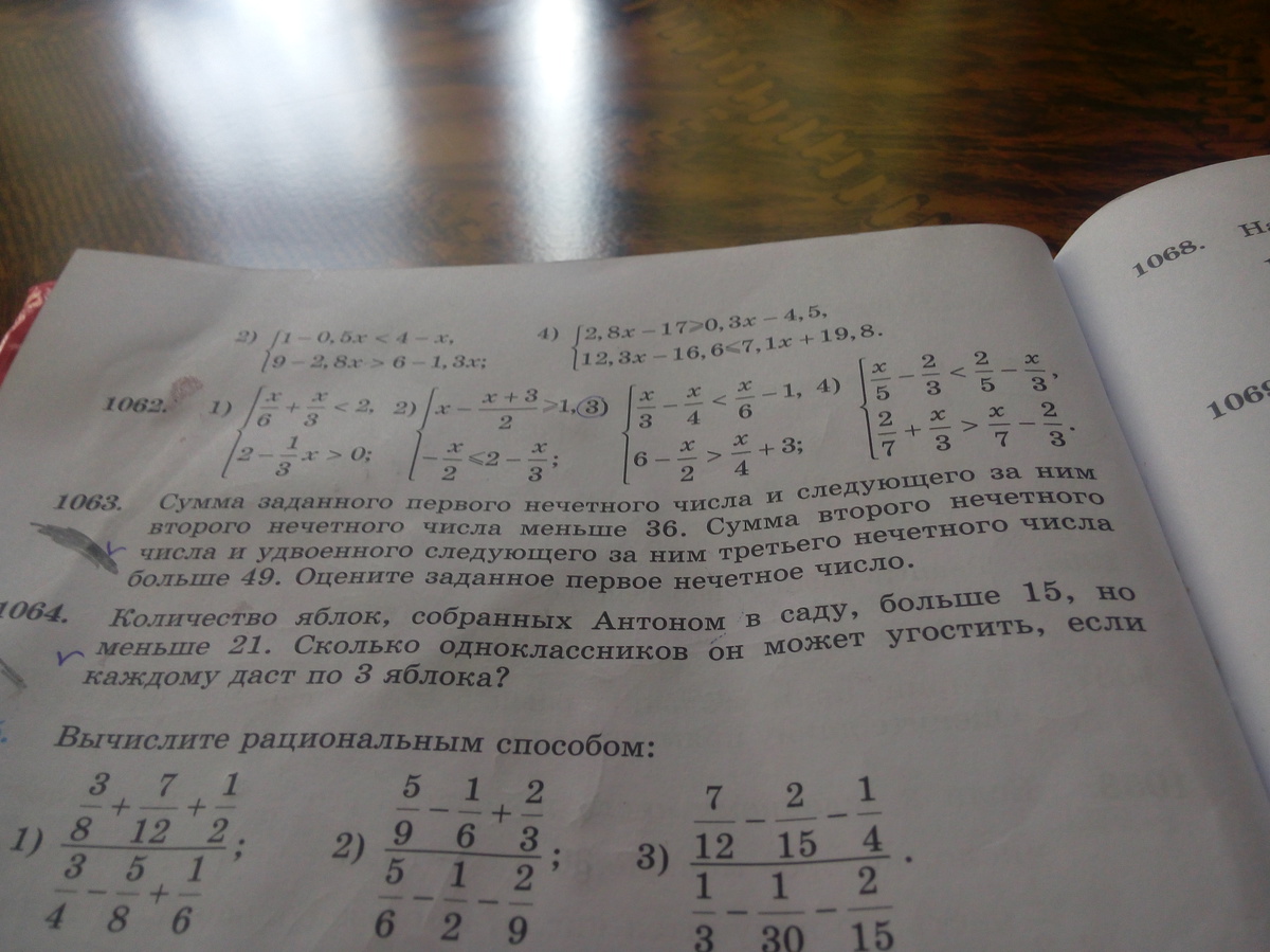 1063. Рассуждаем. Сумма двух нечётных чисел будет чётным числом. Если она меньше 36, то max она может быть 34 или 32, 30 и менее, а min это 1+3=4. Возьму сумму 34. Не получается, т.к. 34:2=17 и 17. А по условию они последовательные, значит это сумма 32: 15+17=32. Сумма второго нечётного числа (17) и следующего нечётного числа * на 2 больше 49. 17+19*2=55 подходит. Возьму числа 13 и 15. 13+15=28 (первое условие выполняется. 28<36). 13+15*2=45 (второе условие уже не выполняется, так как 45<49).