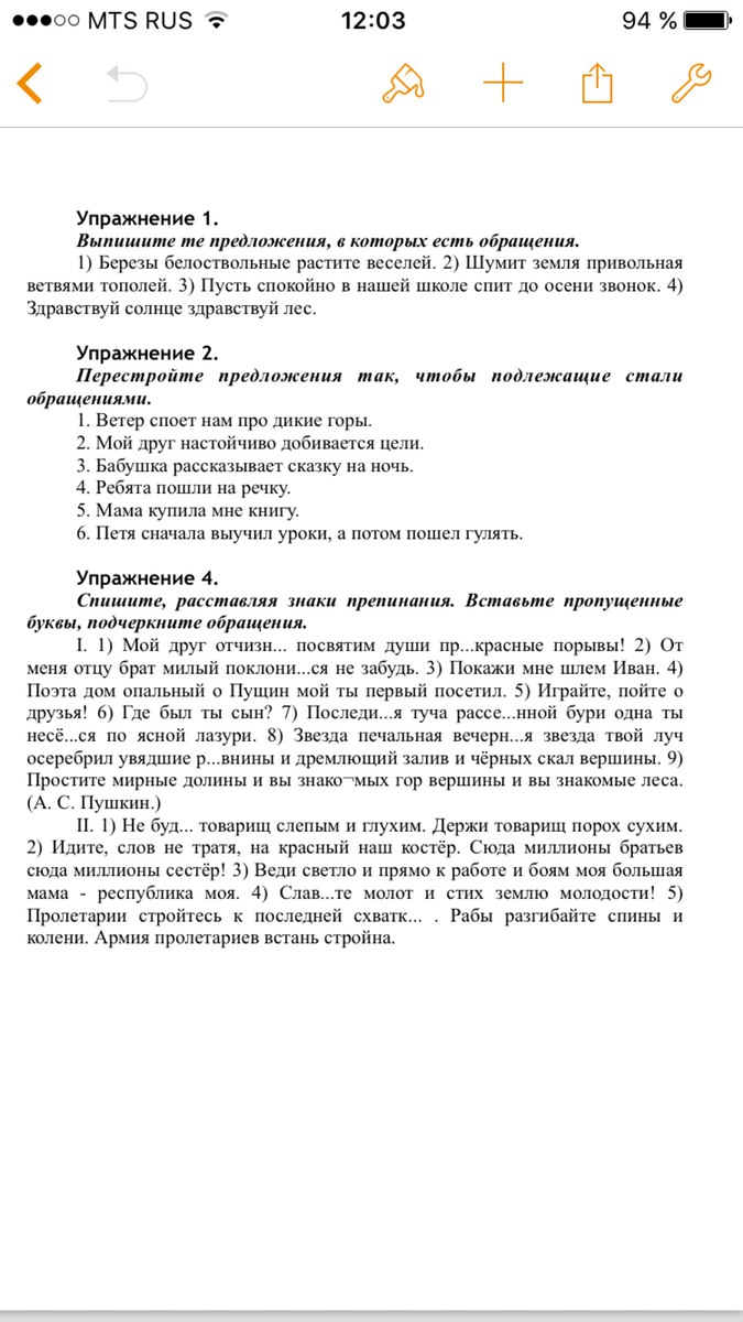 I. 1) Мой друг; 2) брат милый; 3) Иван; 4) о Пущин мой; 5) о друзья; 6) сын; 7) Последняя туча рассеянной бури; 8) Звезда печальная, вечерняя звезда; 9) мирные долины, знакомых гор вершины, знакомые леса.