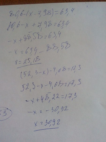 как решить уравнение 80,6-(х-7,98)=63,4 и (52,3-х)-4,08=17,3
