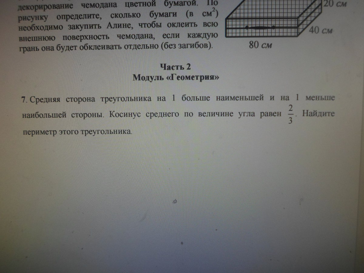 Обозначим х = сх + 1 = ах + 2 = bТеорема косинусова^2 = b^2 + c^2 - 2bcCosAподставим значения(х + 1)^2 = (x+2)^2 + x^2 - (2 (x+2)x)*2/3x^2 + 2x + 1 = x^2 + 4x + 4 +x^2 - (2x^2 + 4x)*2/3x^2 + 2x + 1 - x^2 - 4x - 4 =x^2 - (2x^2 + 4x)*2/3-2x - 3 =x^2 - (2x^2 + 4x)*2/3((2x^2 + 4x)*2/3)*3 = (2x + 3 + x^2 )*34x^2 + 8x = 6x + 9 + 3x^24x^2 + 8x - 6x - 9 - 3x^2 =0x^2 + 2x - 9 =0D = 4 - 4 *1 * (-9) = 4 + 36 = 0x1 = (-2 -V40)/2 = -1 - V10 = -4.16x2 = (-2 + V40)/2 = -1 + V10 = 2.16 Выбираем x2c = x2 = 2.16a = c + 1 = 1 + 2.16 = 3.16b = a + 1 = 3.16 + 1 = 4.16