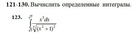 intlimits_{ sqrt{3} }^{ sqrt{7} }frac{x^3dx}{sqrt[3]{(x^2+1)^2}}=left[begin{matrix}t=x^2+1,, dt=2xdx, \ x^3dx=frac{(t-1)dt}{2}end{matrix}right]=intlimits_{4}^{8}frac{(t-1)dt}{2sqrt[3]{t^2}}=
