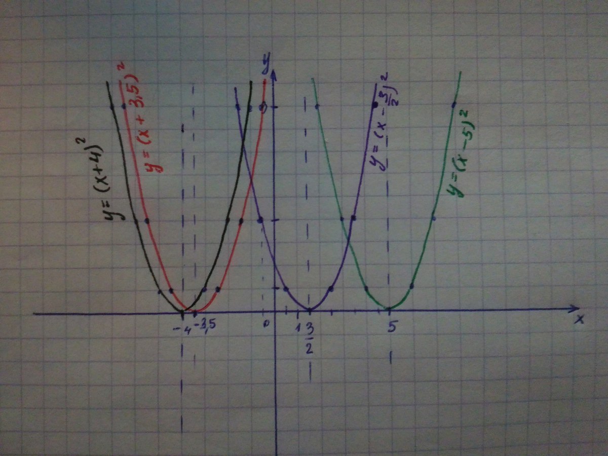 На одной координатной плоскости постройте график функции:1)y=(x+4)^2 2)y=(x-5)^2 3)y = (x-1,5)^2 4)y=(x+3,5)^2