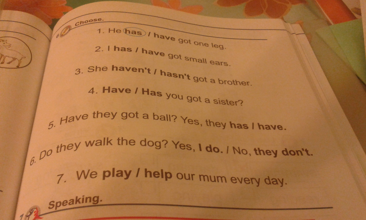 Choose. 1.He has got one leg. 2.I has /have got small ears. 3. She haven't/hasn't got a brother. 4. Have/Has you got a sister? 5. Have they got a ball? Yes, they has/have. 6.Do they walk the dog? Yes, I do./No, they don't. 7.We play/help our mum every day.