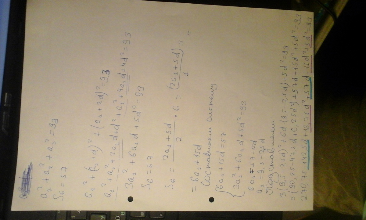 Известно, что (аn)- арифметическая прогрессия, в которой а1^2+а2^2+а3^2=93, S6=57. Найдите а1 и d.