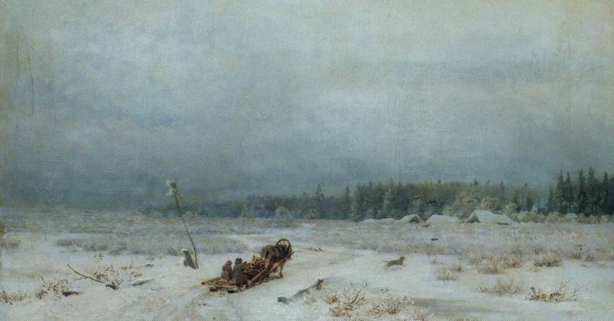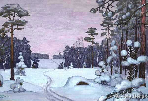 в книгах разные рисунки в основном ставят картину Каменева Зимняя дорога
