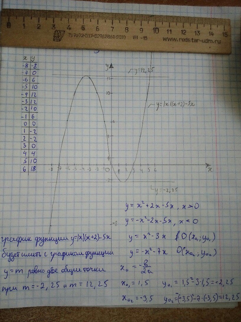 постройте график функции y=|x|(x+2)-5x и определите при каких значениях m прямая y=m имеет с графиком ровно 2 общие точки. Помогите, пожалуйста, с решением!