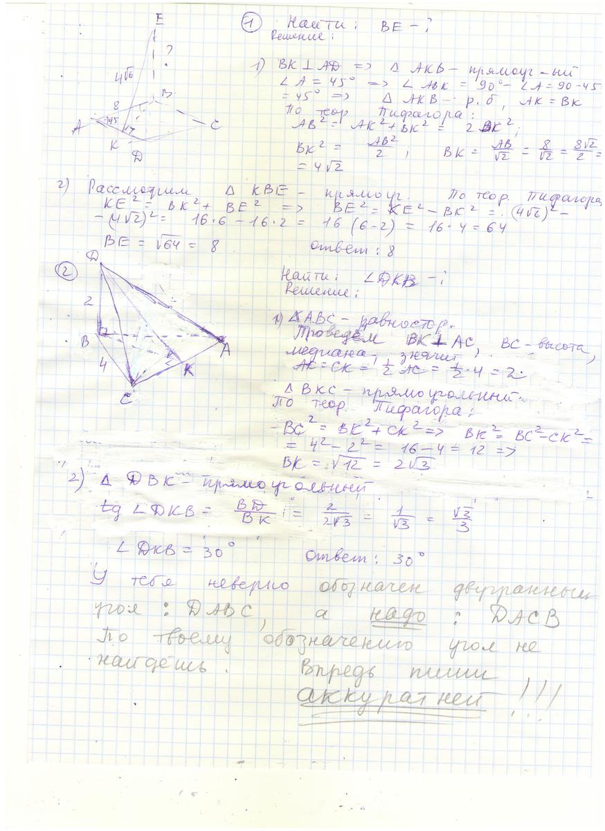 2) Основанием тетраэдера dabc является правильоый треугольник abc со стороной 4 см . Грани dbc и dba перпендикулярны пооскости оснооания. Их общее ребро равно 2 см. Найдите величину двугранного угла dabc. (Ответ 30)