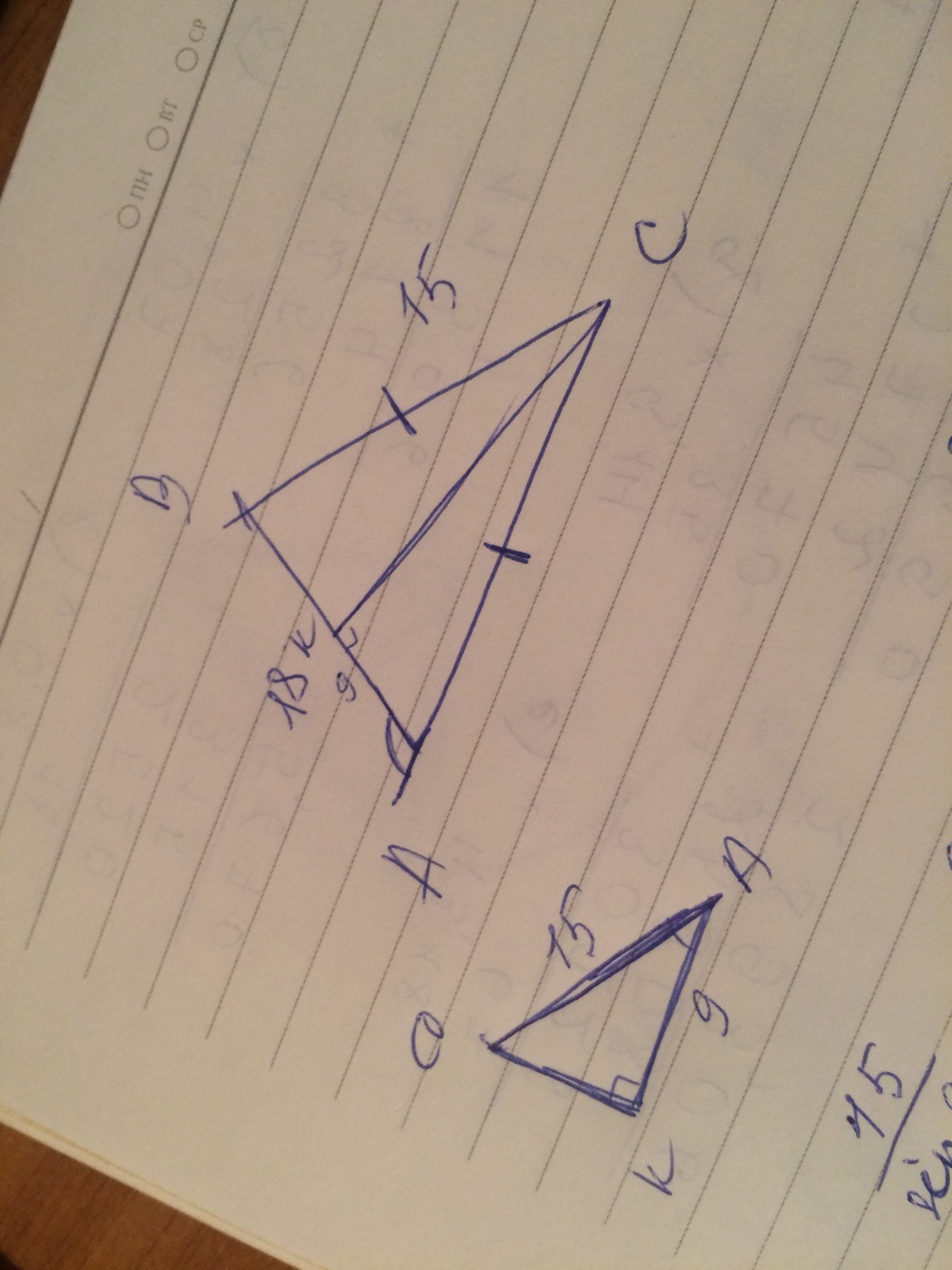 Так как стороны АС и ВС равны, то этот треугольник равнобедренный. Высота, опущенная на основание в равнобедренном треугольнике также является медианой, то есть эта высота разделит сторону АВ пополам. Мы получаем новый прямоугольный треугольник, например, АСК, где угол К = 90, СА = 15 по условию и АК = 9 по только что доказанному. По теореме синусов получаем, что 15sin90 = 9sinA, отсюда получаем, что sinA = 915 (так как синус 90 равен 1), сокращаем и получаем sinA=35. Синусы смежных углов равны, а значит, что синус внешнего угла при вершине А равен синусу внутреннего угла при это вершине, то есть 35