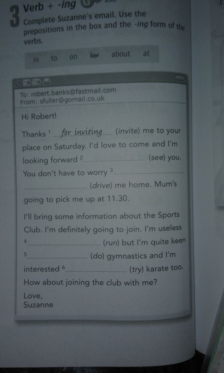 2) to seeing 3)about driving 4)at running 5)on doing 6) in trying