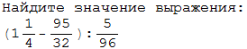 (1 1/4 - 95/32) : 5/96 = (5/4 - 95/32) * 96/5 = 96/4 - 95 * 96 / 32 * 5 = 24 - 3 * 19 = 24 - 57 = -33