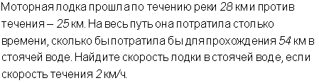 Пусть х(км/ч)-собственная скорость лодки (т.е. скорость в стоячей воде), тогда скорость лодки по течению (х+2)км/ч, а против течения (х-2)км/ч. Время движения лодки по течению 28/(х+2)ч, против течения 25/(х-2)ч, в стоячей воде 54/х (ч). По условию лодка затратила на весь путь по течению и против течения столько же времени сколько на путь в стоячей воде. Составим и решим уравнение:
