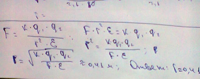 2.Определите расстояние между двумя точечными разноименными зарядами q1=40 нКл и q2=-80 нКл, находящимисяв керосине(эксилент=2,1), если модуль силы их электростатического взаимодействия F=80 мкН.