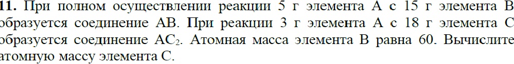 на 3 г А приходится два С - 18 г, значит один С - 9 г, т.е. С а 3 раза тяжелее А, значит атомная масса элемента С = 60