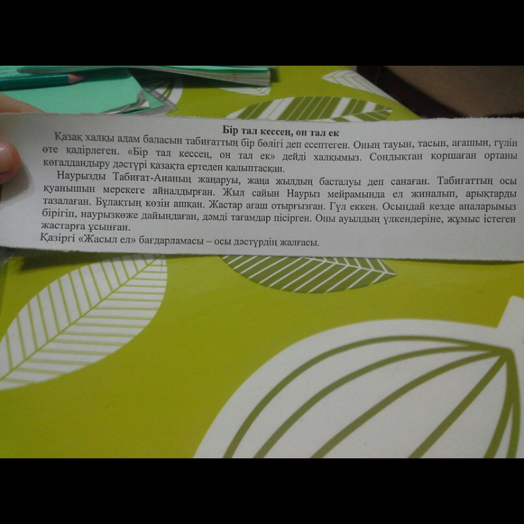 Издавно казахи считали человека частичкой природы. Они очень уважали природу: горы, деревья, цветы. "Если вырубишь одно дерево, то на его место должен посадить десять таких деревьев" так говорил наш народ. Вот поэтому казахи с давних времен относились к окружающей среде со всей бережностью.