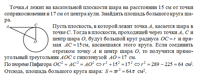 точка А лежит на касательной плоскости шара на расстоянии 15 см от точки соприкосновения и 17 см от центра кули.знайдить площадь большого круга шара