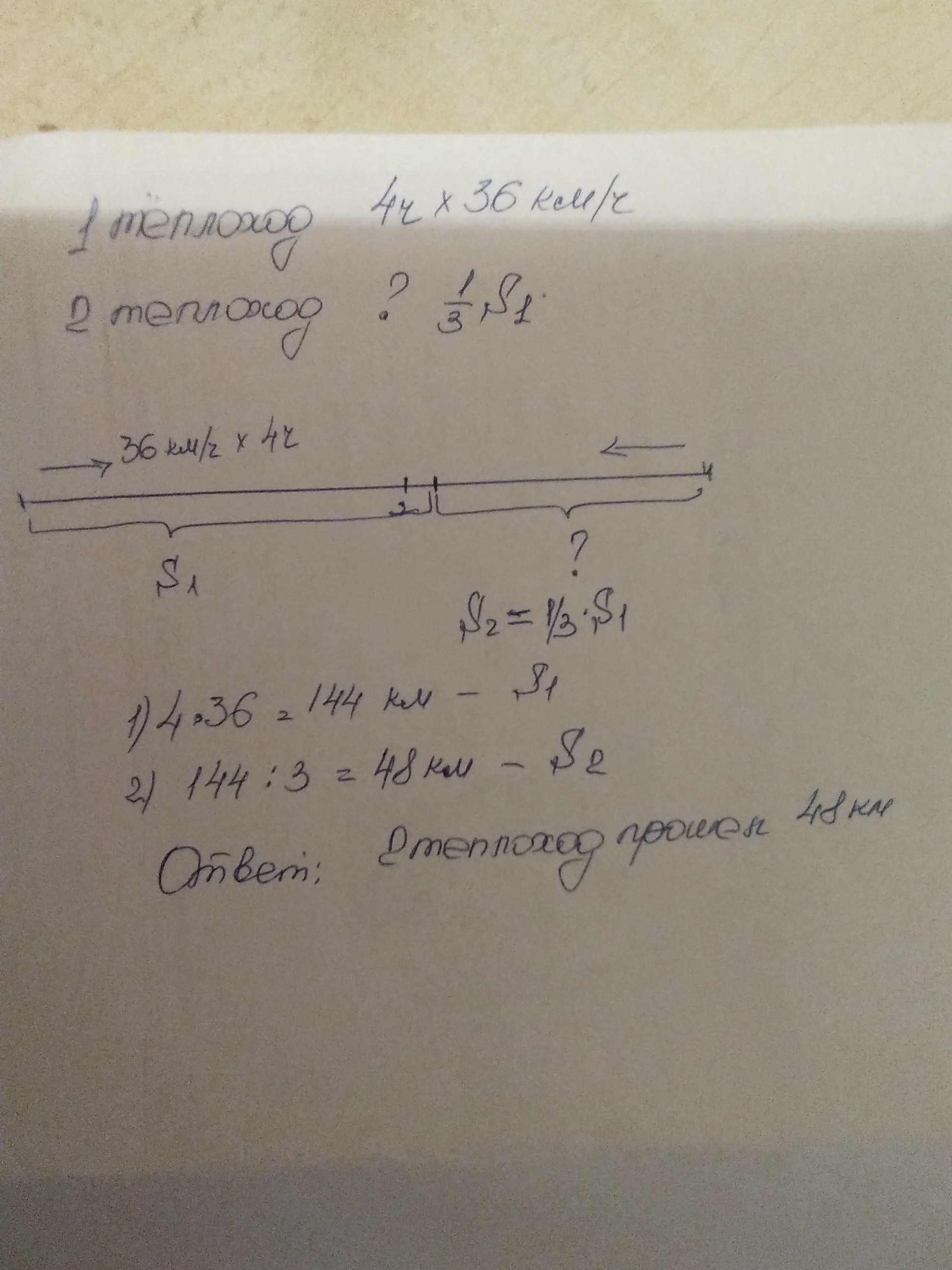 От двух пристаней отправились навстречу друг другу два теплохода. Один из них шёл до встречи 4ч со ср. ск 36км/ч. Другой теплоход прошёл до встречи третью часть пути, пройденного первым. Какое расстояние прошёл до встречи второй теплоход?