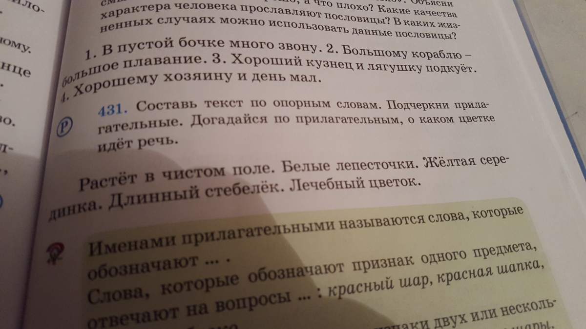 Ромашка растёт в чистом (прил.) поле. У неё есть белые(прил.) лепесточки, жёлтая(прил.) серединка и длинный(прил.) стебелёк. Ромашка - лечебный(прил.) цветок.